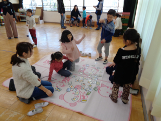 お正月遊び(年長組) 2019年1月11日 13時18分 年長組のお正月遊びは午後行いました。お友達やおうちの方と一緒に、すごろくをしたり、かるたをしたり、福笑いをしたり、屋上では竹馬をしました。羽子板は難しいです。