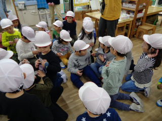 白金保育園との交流(年長) 2019年1月15日 17時09分 楽しみにしていた、白金保育園との交流です。安全に歩行して出かけました。保育園の先生の話をよく聞いて、くじ引きでグループ決めをしました。ホールでは、こまや羽根つき、保育室では、けん玉やすごろくなどで、保育園の友達と一緒に遊びました。保育園との交流も、残り1回となりました。同じ小学校になったり、公園であったりするかもしれません。地域での交流を進めたいです。