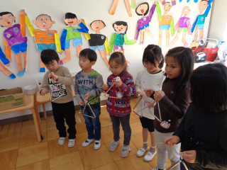 合奏ごっこ(年長) 2019年1月22日 13時46分 好きな楽器を選んでリズムうちをします。先生のリズムに合わせて打ちます。♩ ♩ ♩♩♩ ♩ ♩ ♩♩♩色々な楽器に挑戦します。リズムを合わせようと、真剣です。♡音があって気持ちいいね。楽しいね。